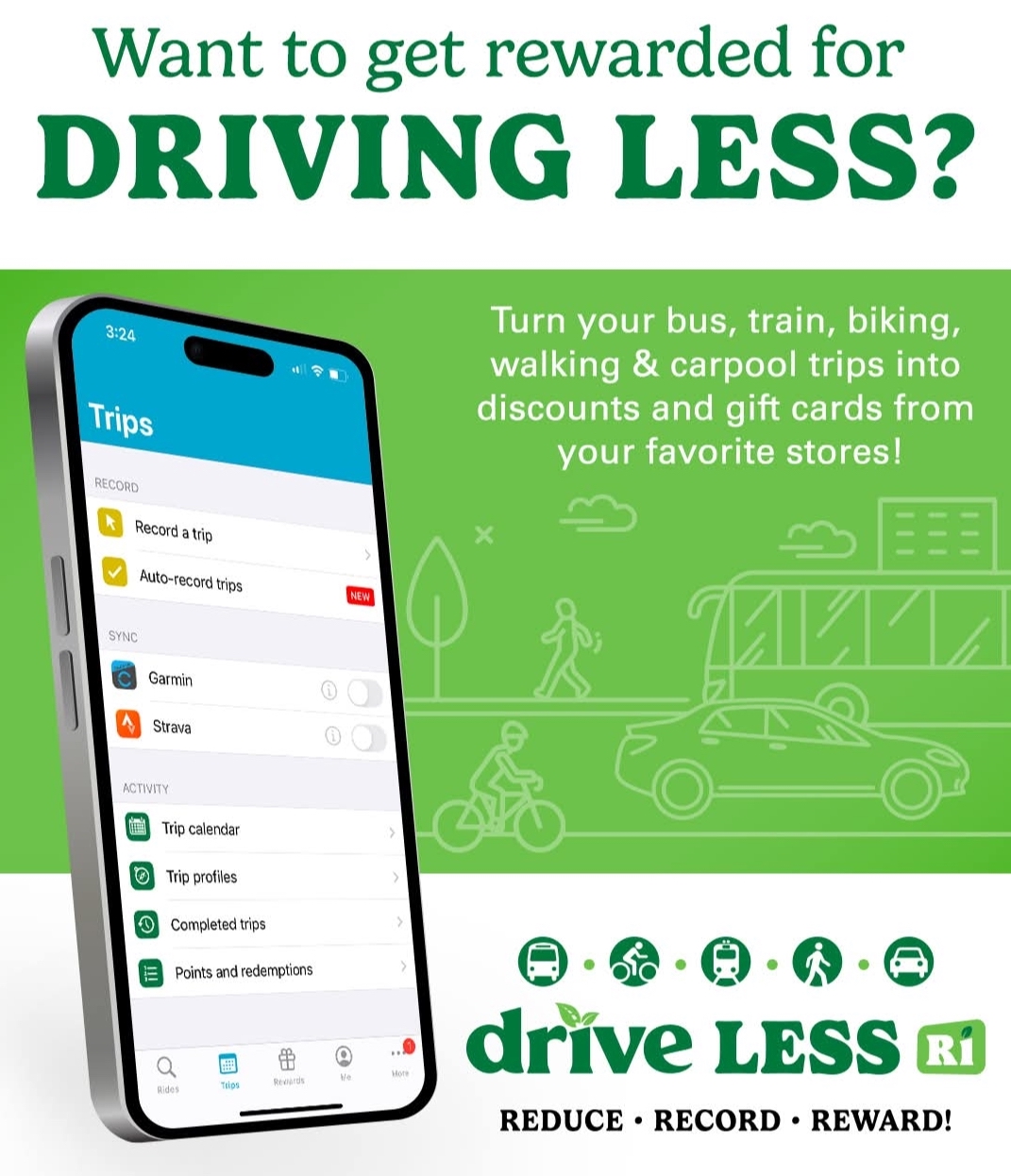 «Conduce Menos RI» es una aplicación de planificación y registro de viajes donde los usuarios pueden ganar recompensas al registrar su uso del transporte público, viajes en auto con otras personas, en camioneta compartida, caminatas y bicicleta. La aplicación está disponible para dispositivos iOS y Android, así como para usuarios de computadoras de escritorio.