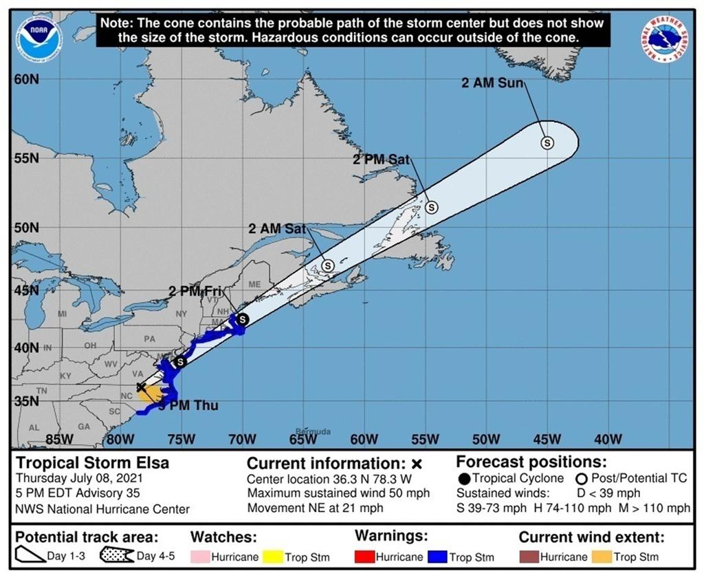 Según las proyecciones del NHC, Elsa continuará moviéndose hoy sobre Carolina del Norte, pasará el viernes por el noreste de los estados de la costa atlántica y llegará a las costas del Atlántico canadiense entre la noche del viernes y el sábado.