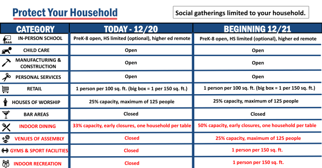 «Después del final de la pausa, no vamos a encender un interruptor y volver a donde estábamos, o terminaremos aquí en unas pocas semanas. En cambio, vamos a relajar lentamente algunas de las restricciones de la pausa y medir su efecto en nuestros casos», explicó la gobernadora, al tiempo de informar que a partir del 21 de diciembre la capacidad dentro de los restaurantes será aumentada de 33 a 50%, los lugares de asamblea podrán abrir con un 25% de su capacidad, los gimnasios podrán reabrir sus puertas, al igual que los centros de deportes bajo techo, mientras que los bares continuarán cerrados.
