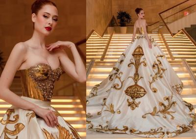El traje, inspirado en la figura de un ángel, fue pintado a mano por el artista visual Yan Páez y la orfebrería de la artista colombiana Diana Herrera, confeccionado en pan de oro sobre un delicado lienzo de ciberlina de seda blanca, todo complementado con incrustaciones de cristales Swarovski.