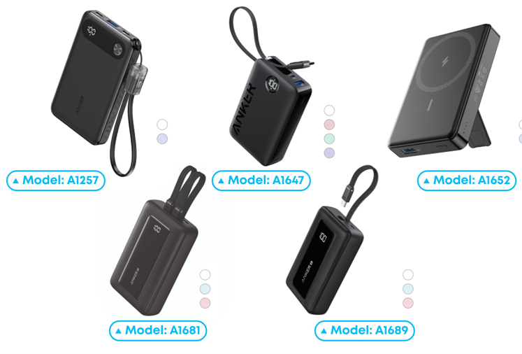Las baterías externas de Anker se utilizan como un dispositivo de carga electrónico portátil para teléfonos inteligentes, computadoras portátiles y tabletas que tienen una potencia de salida máxima de 22.5 W (A1647), 7.5 W (Magsafe A1652), 22.5 W (A1257) y 30 W (A1681 y A1689).