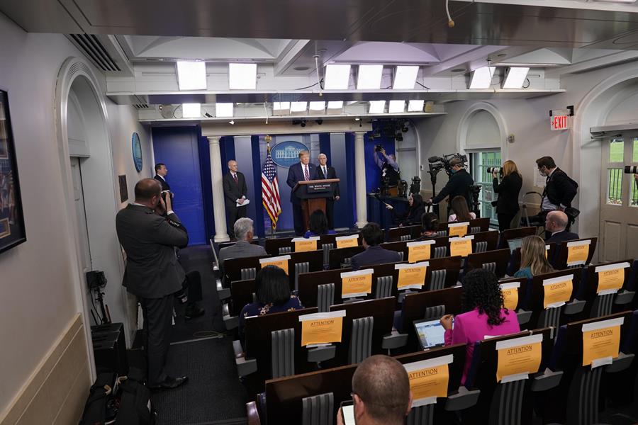 Después de exaltar como acostumbra la labor de su Gobierno para contener la pandemia y de dar paso al vicepresidente Mike Pence y al director de la Administración de Alimentos y Medicamentos (FDA, en inglés), Stephen Hahn; Trump abandonó abruptamente la sala de prensa de la Casa Blanca, seguido por los miembros de su equipo.